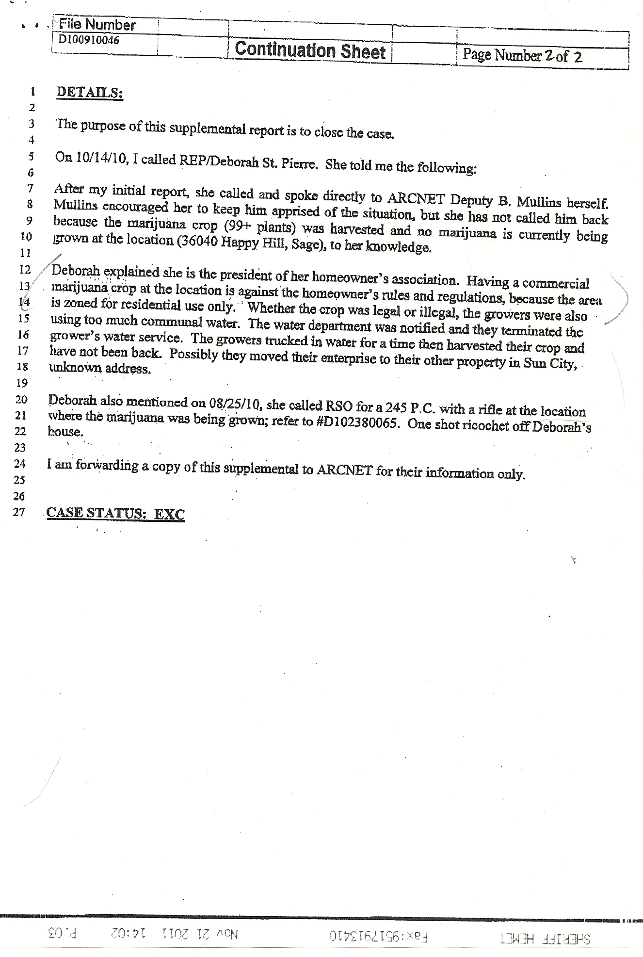October 14, 2010 Deborah St Pierre provided false information to a Riverside County Sheriff.