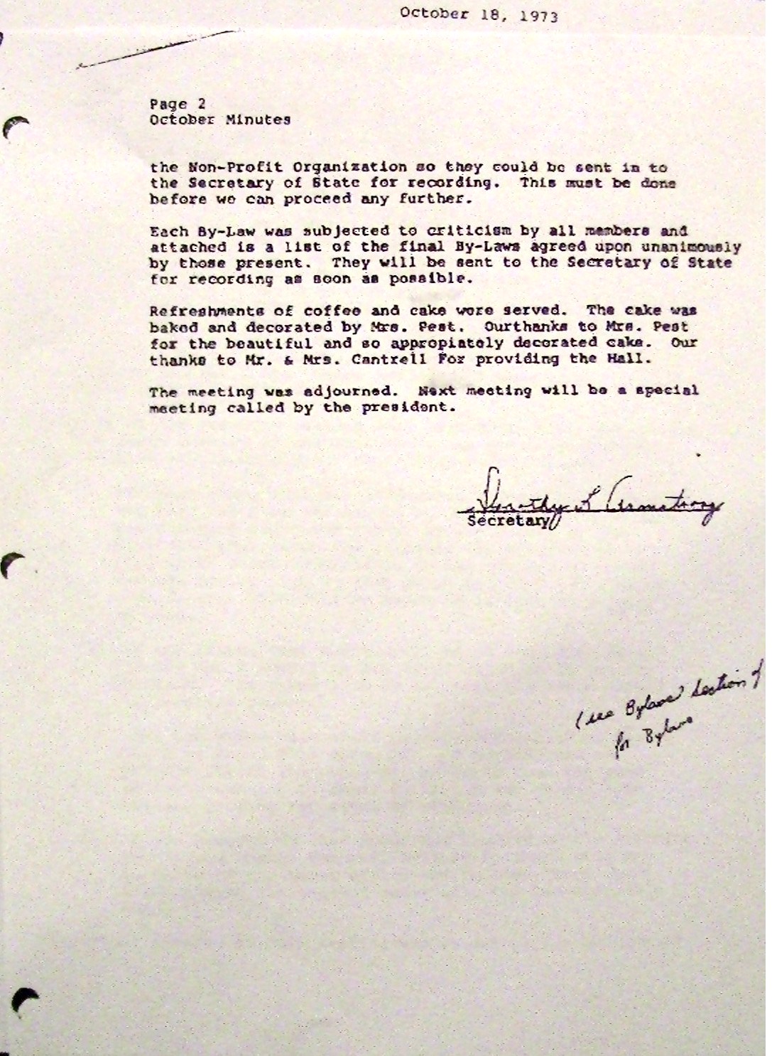 - No bylaws were adapted for the new mutual benefit association consisting of both real property rights owners and the property renter who moved motions as noted by Tina Ziegler who somehow was appointed as a temporary Secretary.