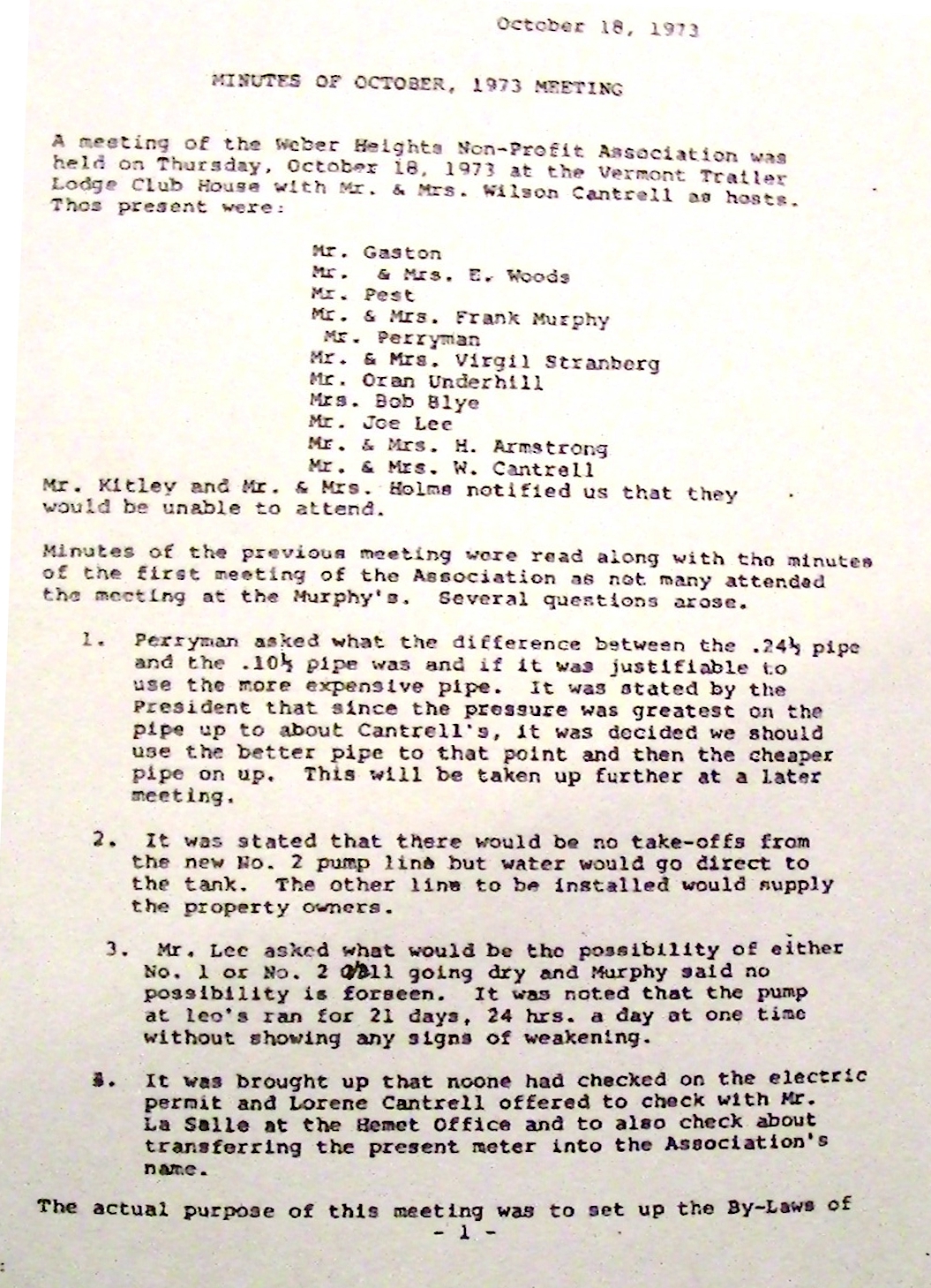 On October 18, 1973 a group of people calling themselves "Weber Height nonprofit Association" held a meeting regarding its bylaws. That group consisted of land owners and want to be land owners. They were trying to start a non-profit Home Owners Association. Somehow they failed to complete the goals set at the meeting.