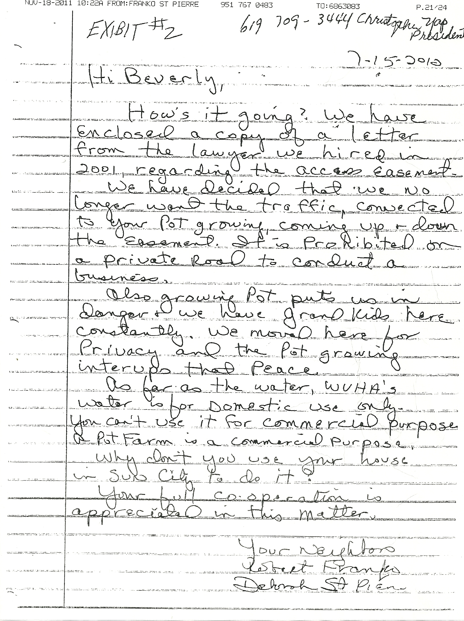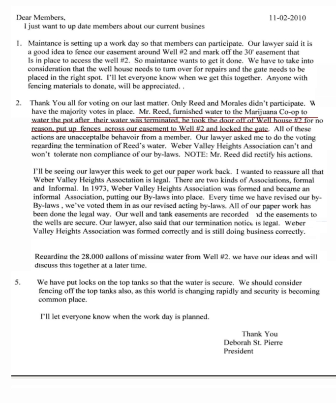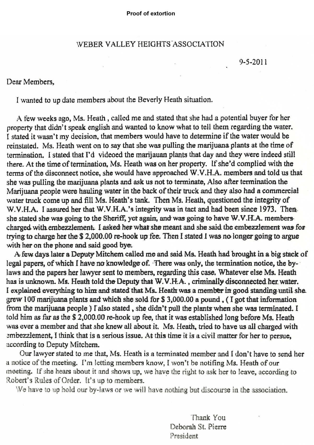 I saw this letter as an attempt to extort Mrs. Beverly Heath into complying with Deborah St Pierre's wishes. Mrs. Beverly Heath owns rights to the wells and rights to the water storage easement. Mrs. Deborah St Pierre knew the Association did not own any rights to the well. She had been informed by an Attorney the Association did not own rights to either of the well. I was there I know what the Attorney told the two of us.