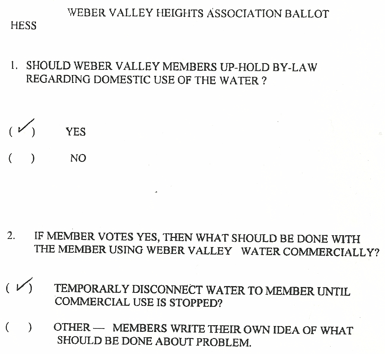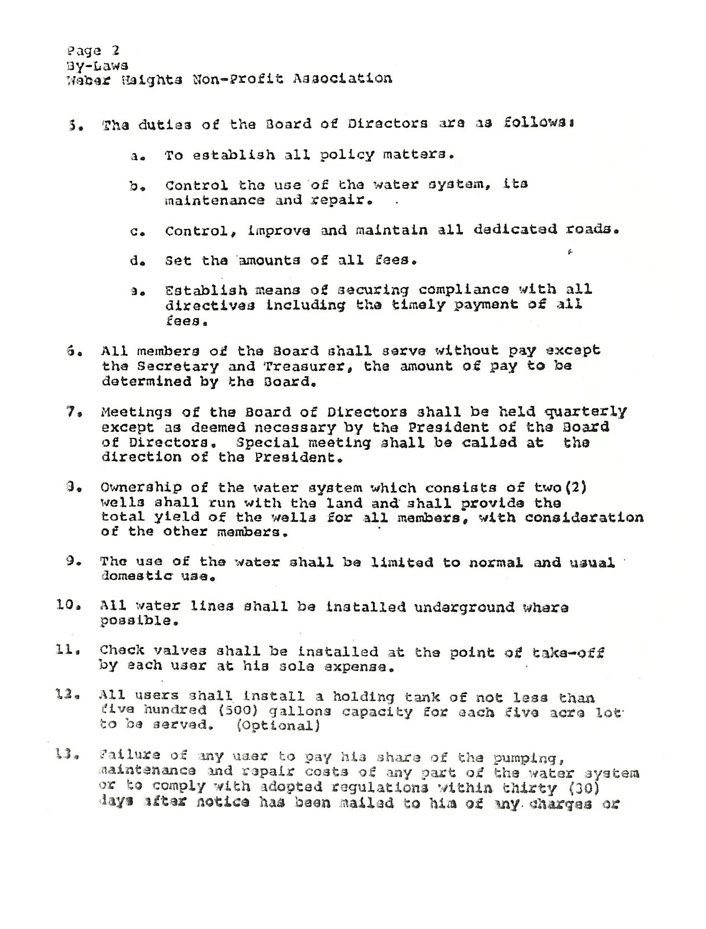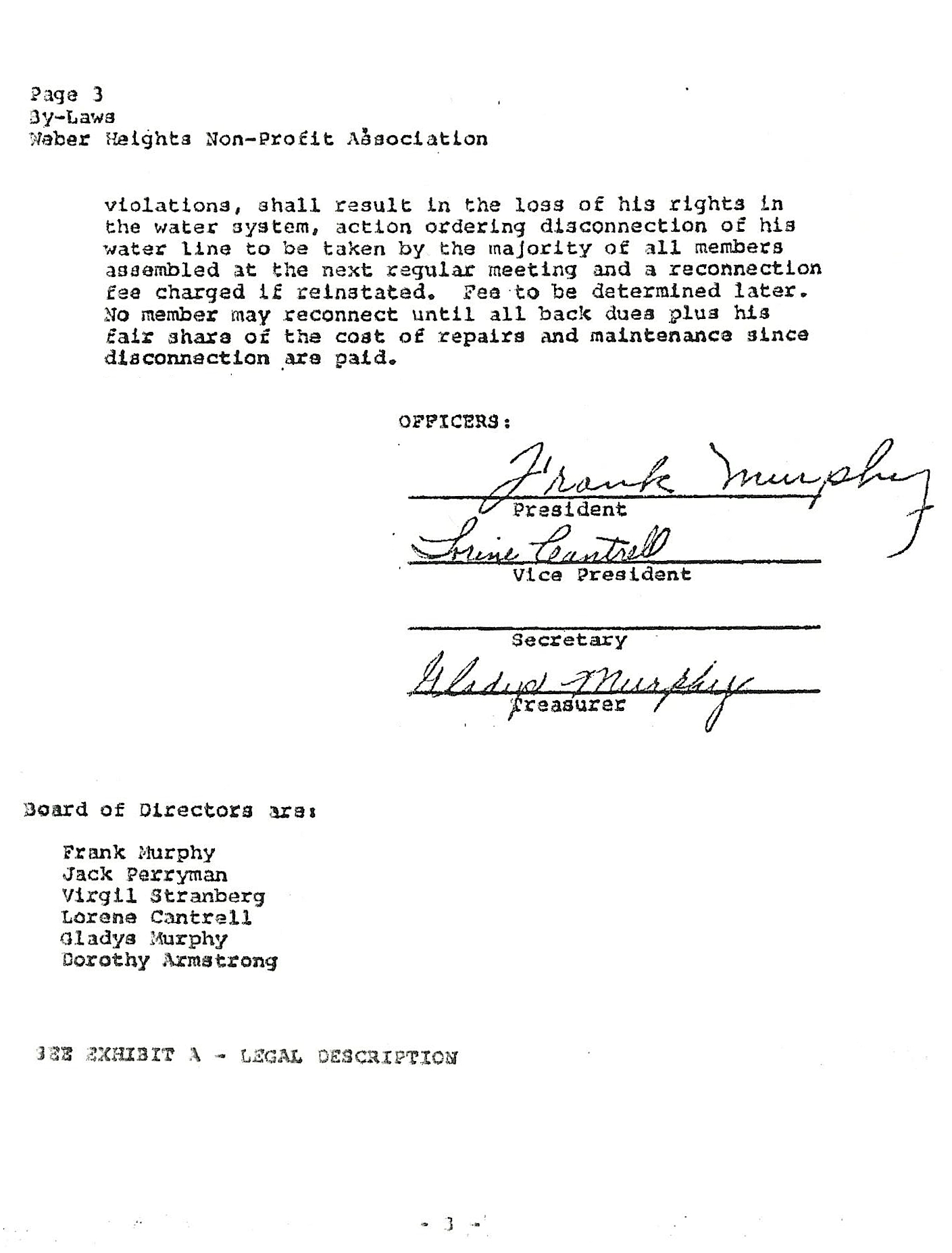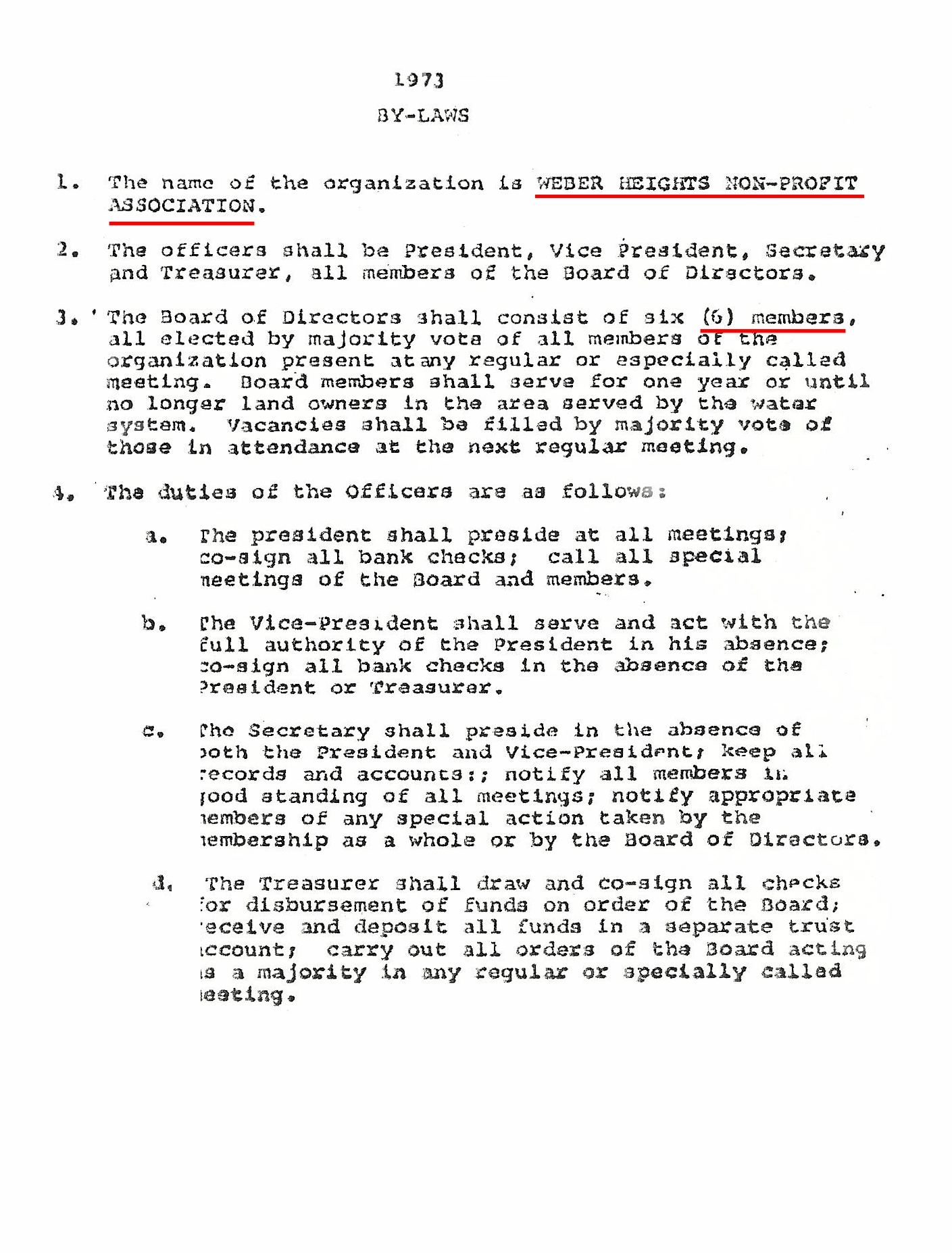 Look back at the 1973 Weber Heights Non-profit Association bylaws, compare them to the acting and revised 2002 Weber Valley Heights Water Association Bylaws. There are two similar yet different named associations having similar but completely different bylaws Page 1. and Page 2.