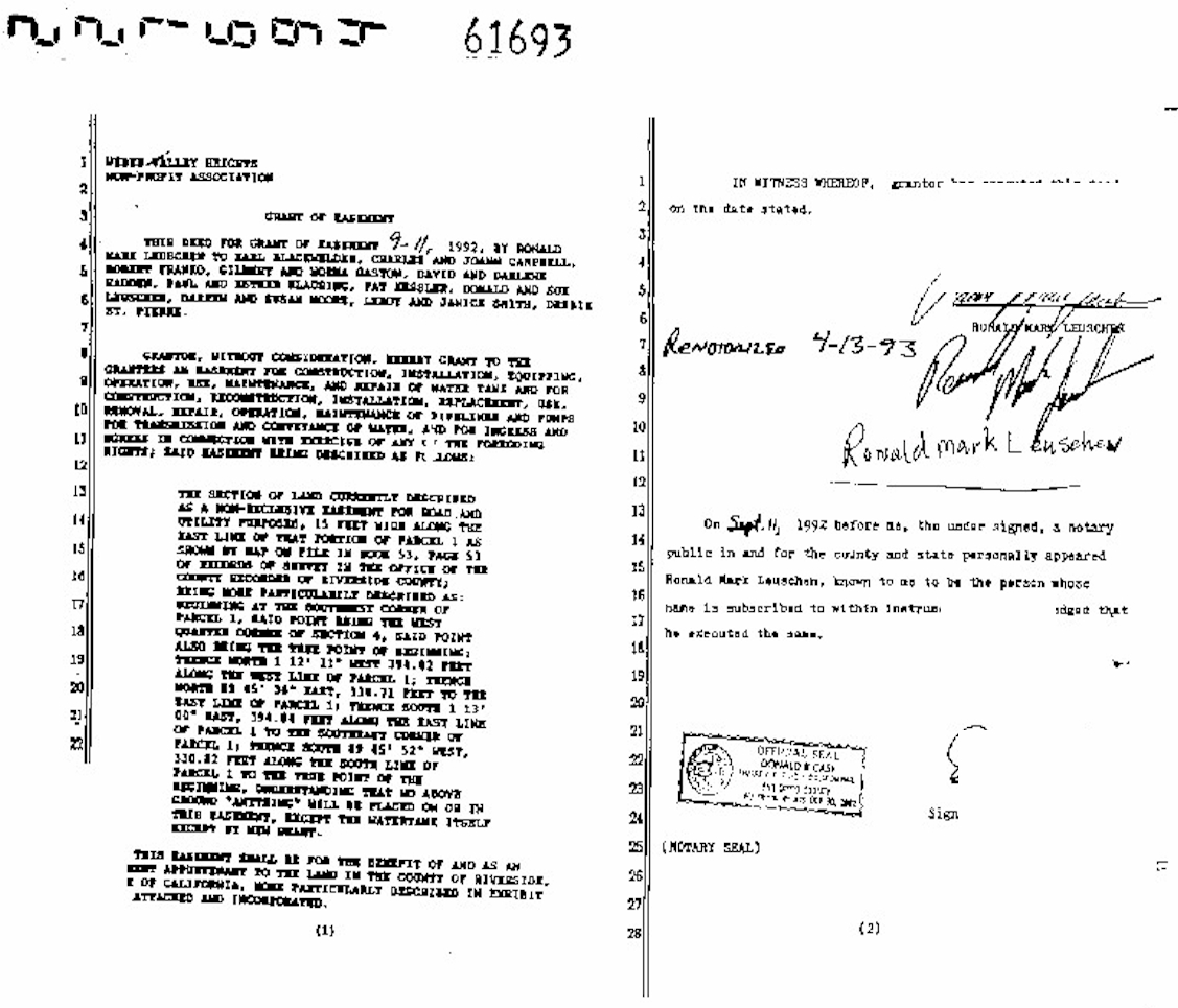 On September 11, 1992 Ronald Mark Leusehen signed a road and water tank "Grant of Easement" # 227694 thereby creating rights to and for a new water storage system. The grant was recorded on May 16, 1993 Pictured here. Mr. Ronald Mark Leushen did not grant rights to the entity known as one Weber Valley Heights Non-Profit Association anywhere within the legally recorded and documented easement rights.