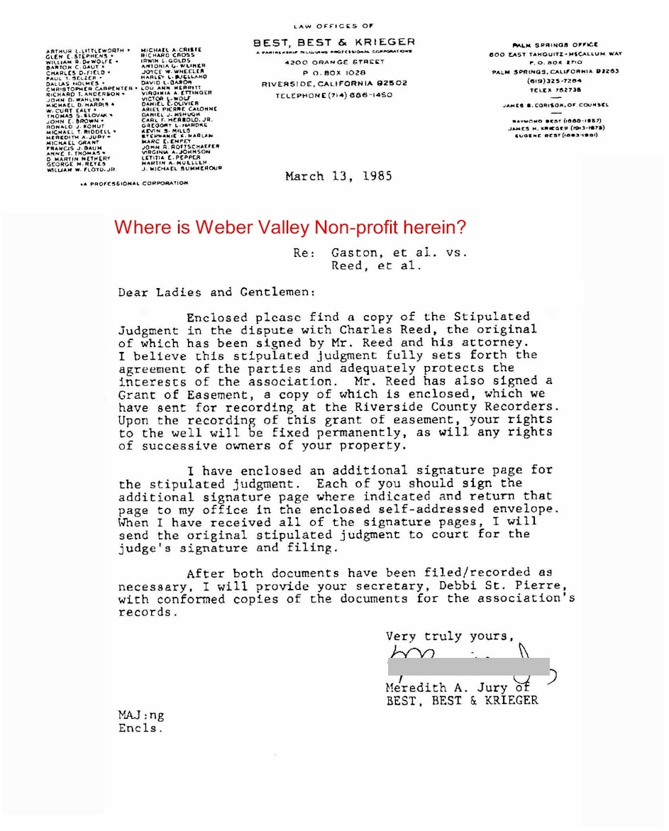 March 13, 1985 an Attorney's notice letter was delivered to property owners and Weber Valley is not named in that letter. How did the rights to the well property pass to the defunct Association? They didn't.