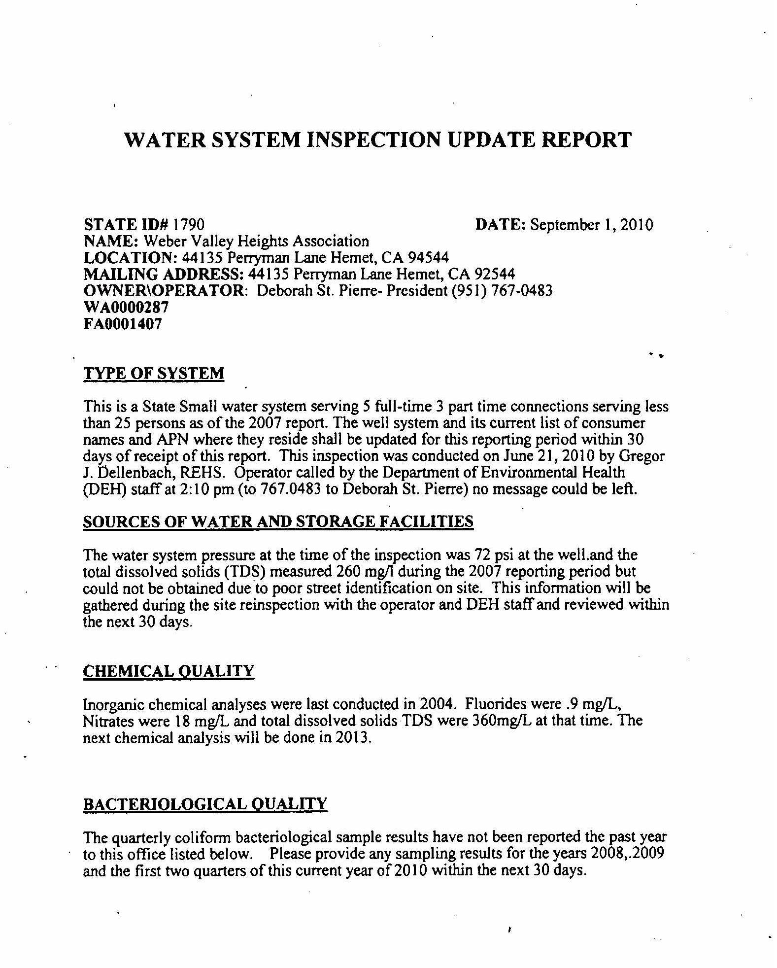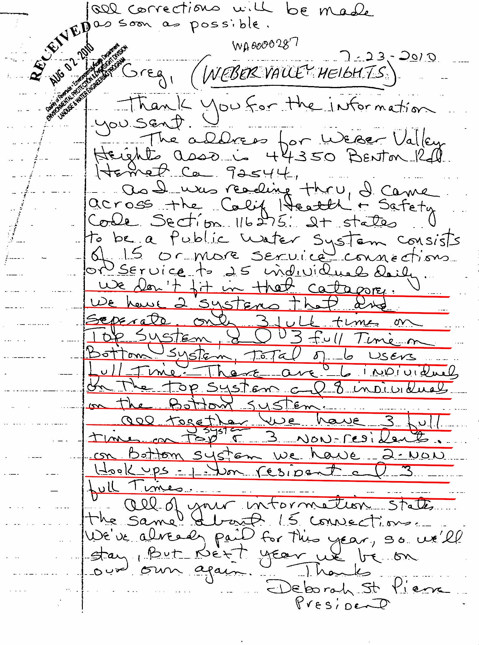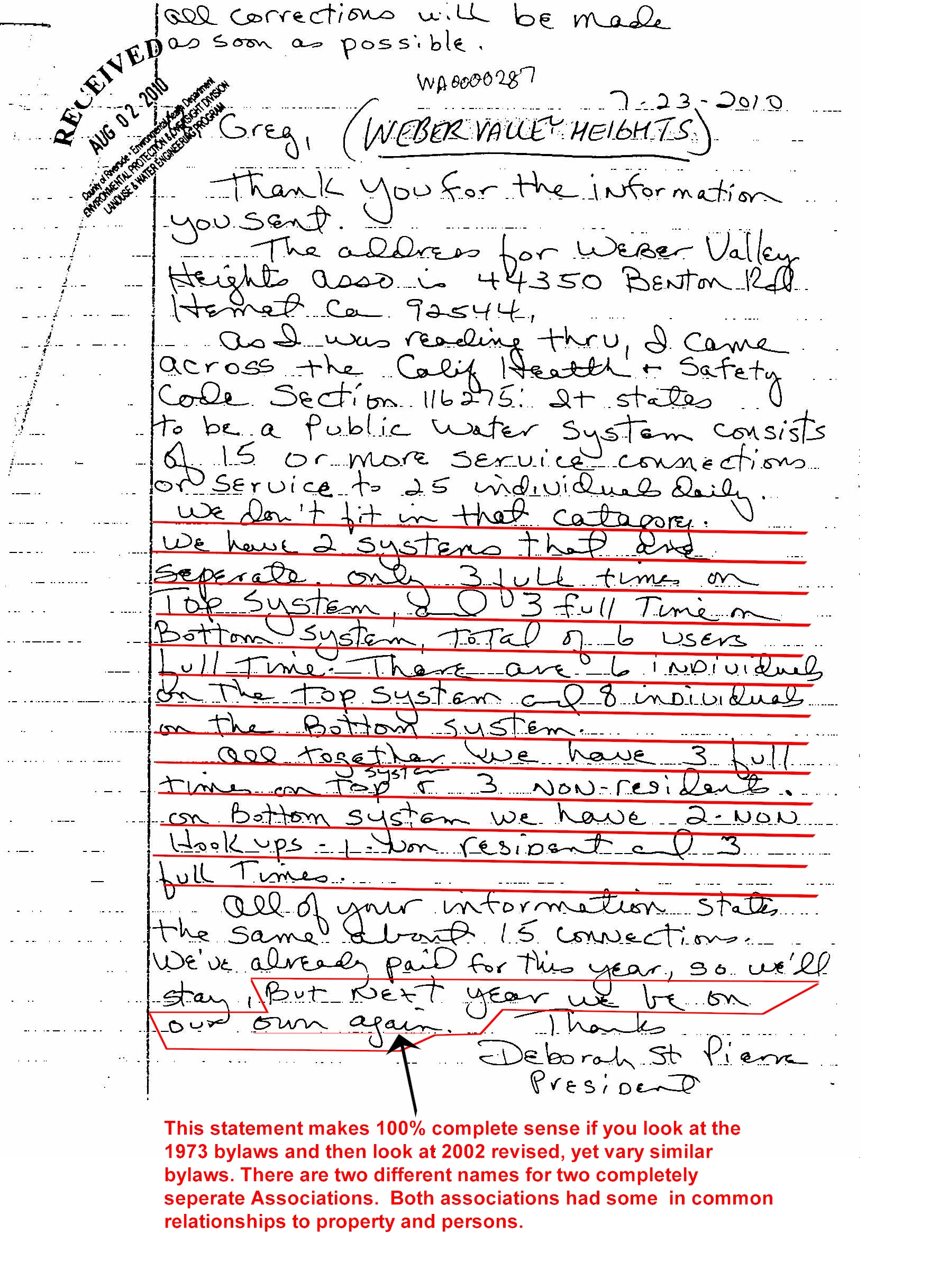 July 13, 2002 The "revised" Association Bylaws now show a new name and that the status as a non-profit no longer exist. This was a new mutual benefit association with new bylaws. California Safe Water Act 64216 Mutual Association Prohibited after November 12, 1991. Why did DEH issue the association a permit to operate? One line at the bottom of a letter provides proof this was a second association that had started. I quote "We be on our own again" was addressed to DEH by Mrs. Deborah St Pierre. The meaning behind that quote may have been we were on our own and without DEH before we revised the newly named Association.