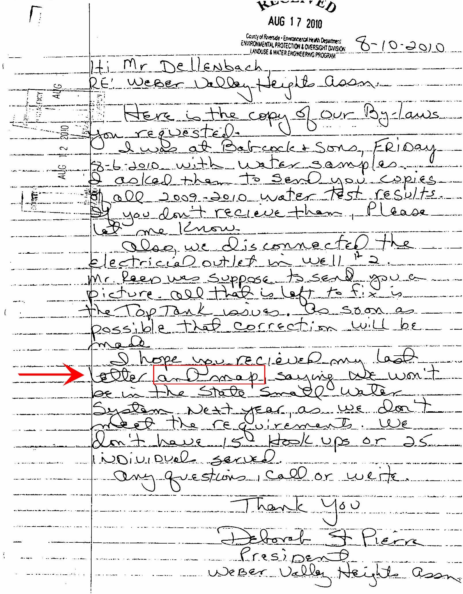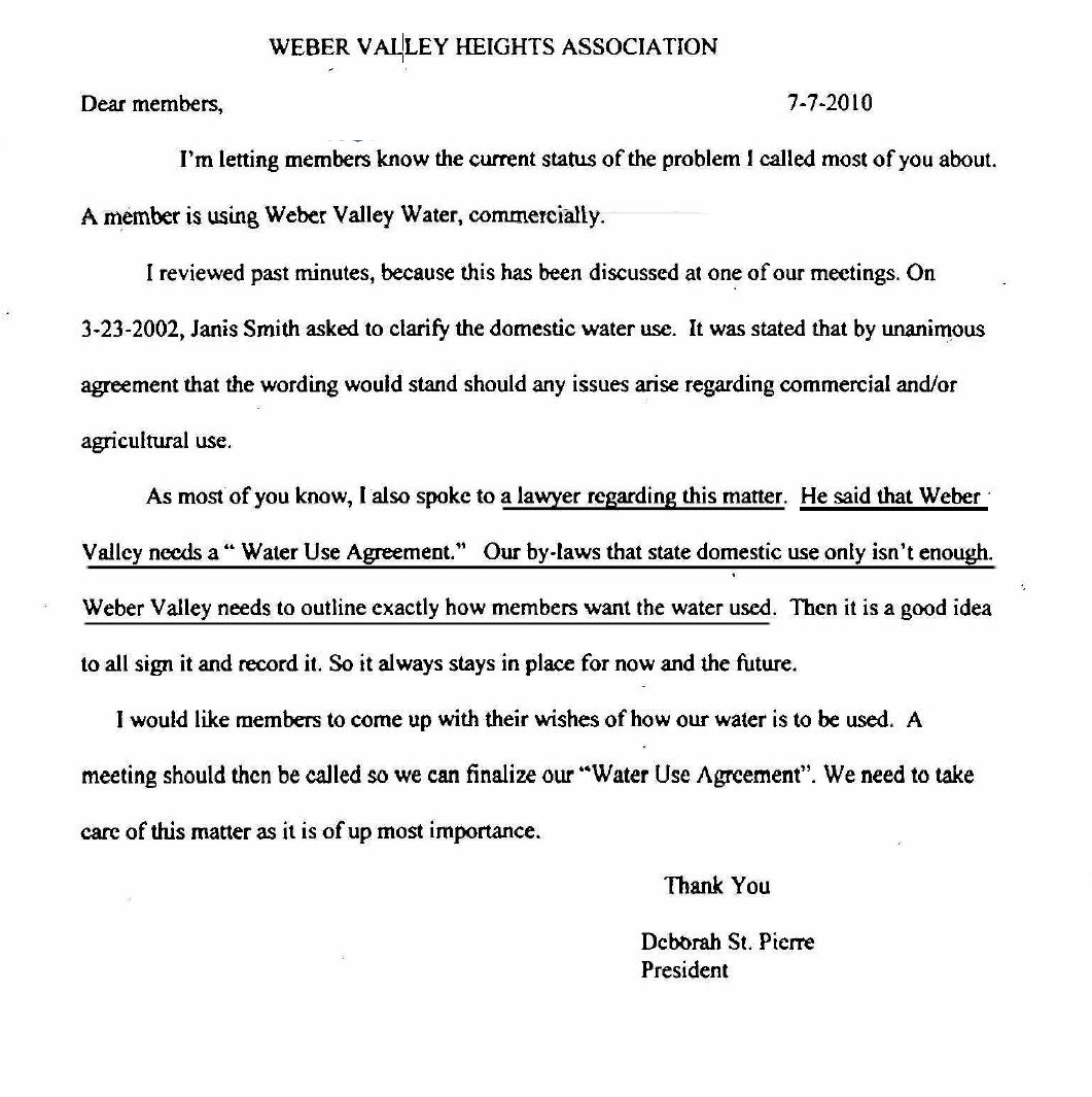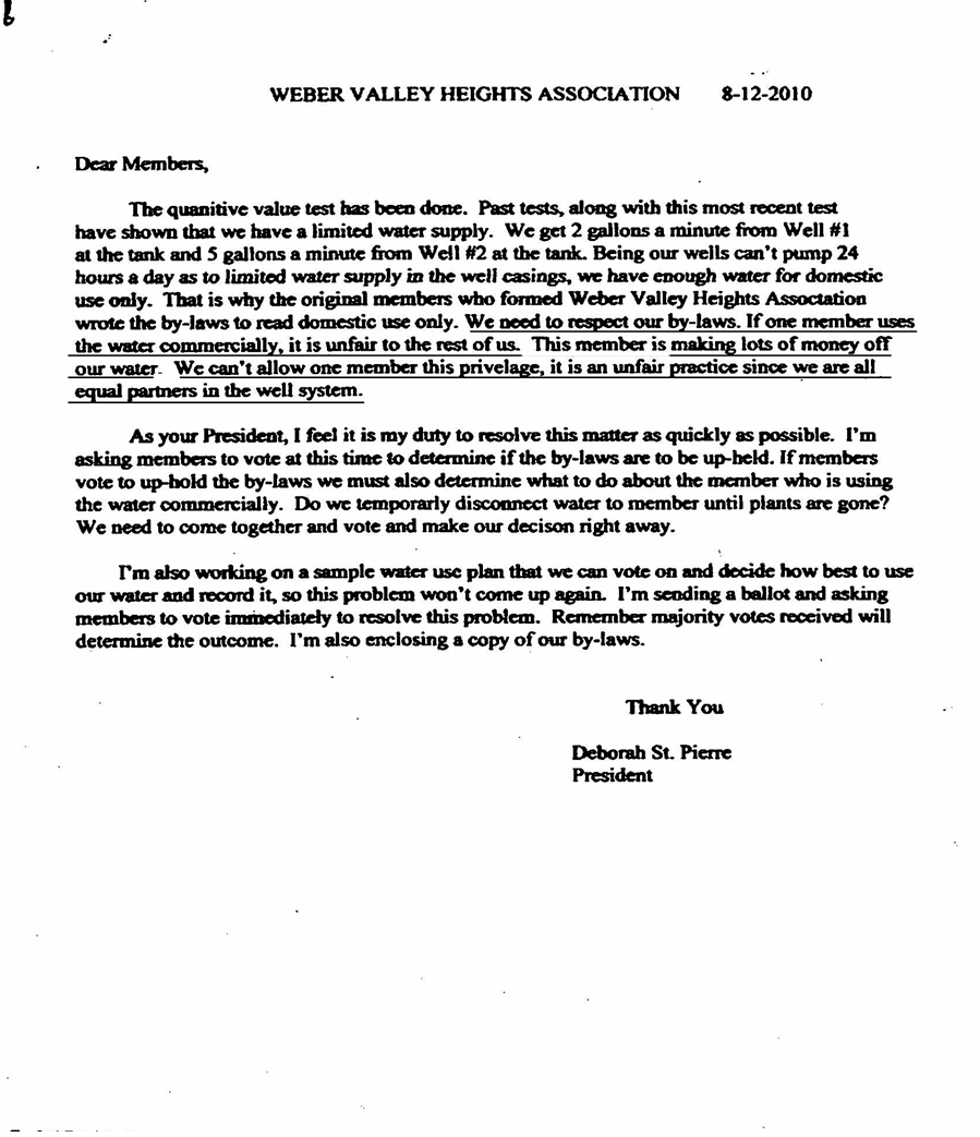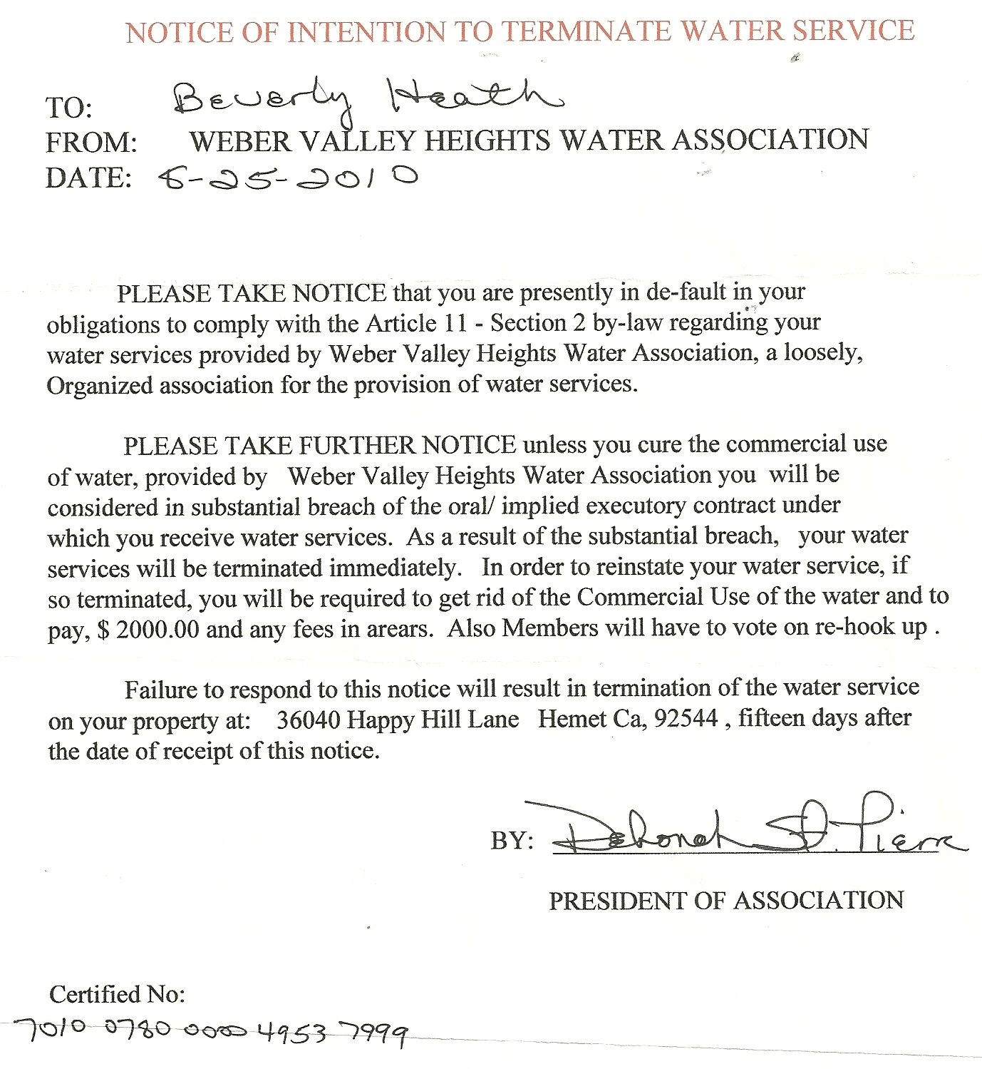 August 23, 2010 it was Deborah who wrote and sent the "Notice of intention to terminate water service". The illegal ballots she sent out never mentioned "termination of water services". Even if they did the Association does not own a right to say how water is or is not used and Mrs. St Pierre claimed Heath was using water commerically.