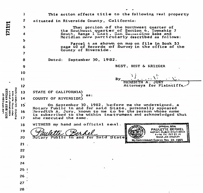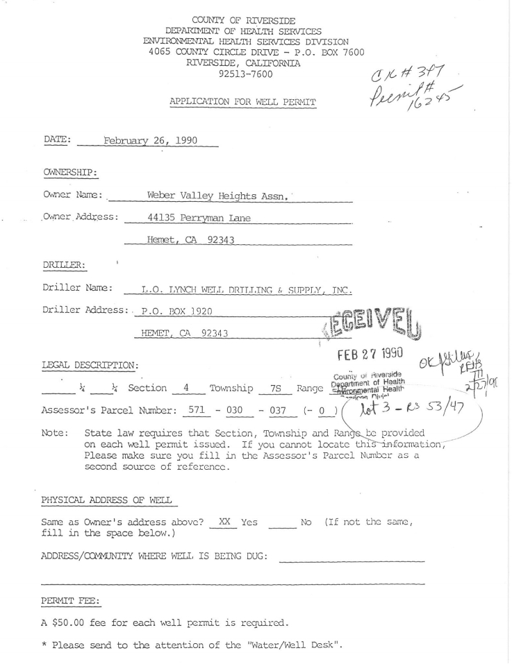 February 26, 1990 an application for a well driller's permit was submitted to Riverside County Environmental Health for APN #571-030-037. AKA Deborah St Pierre's property.