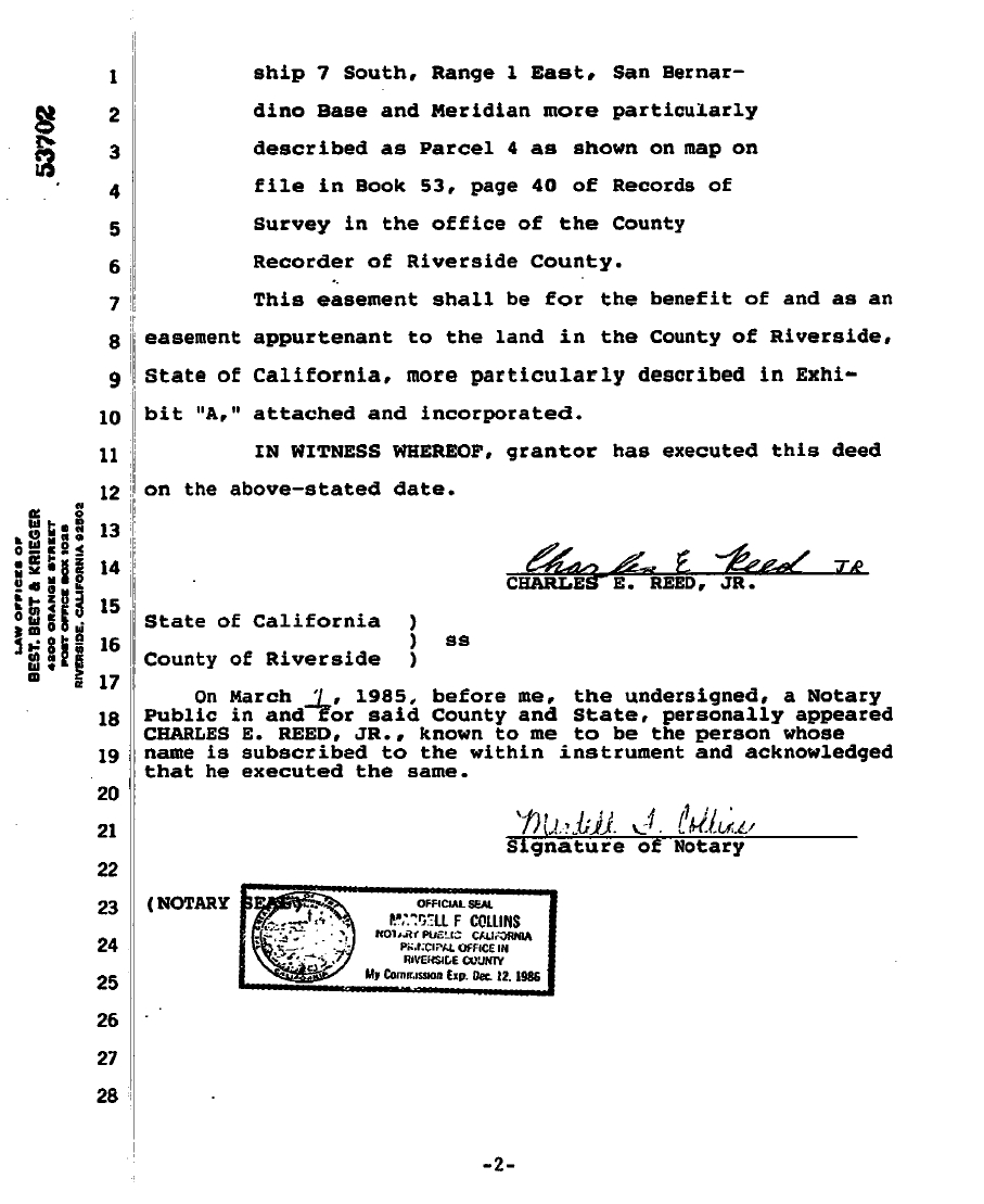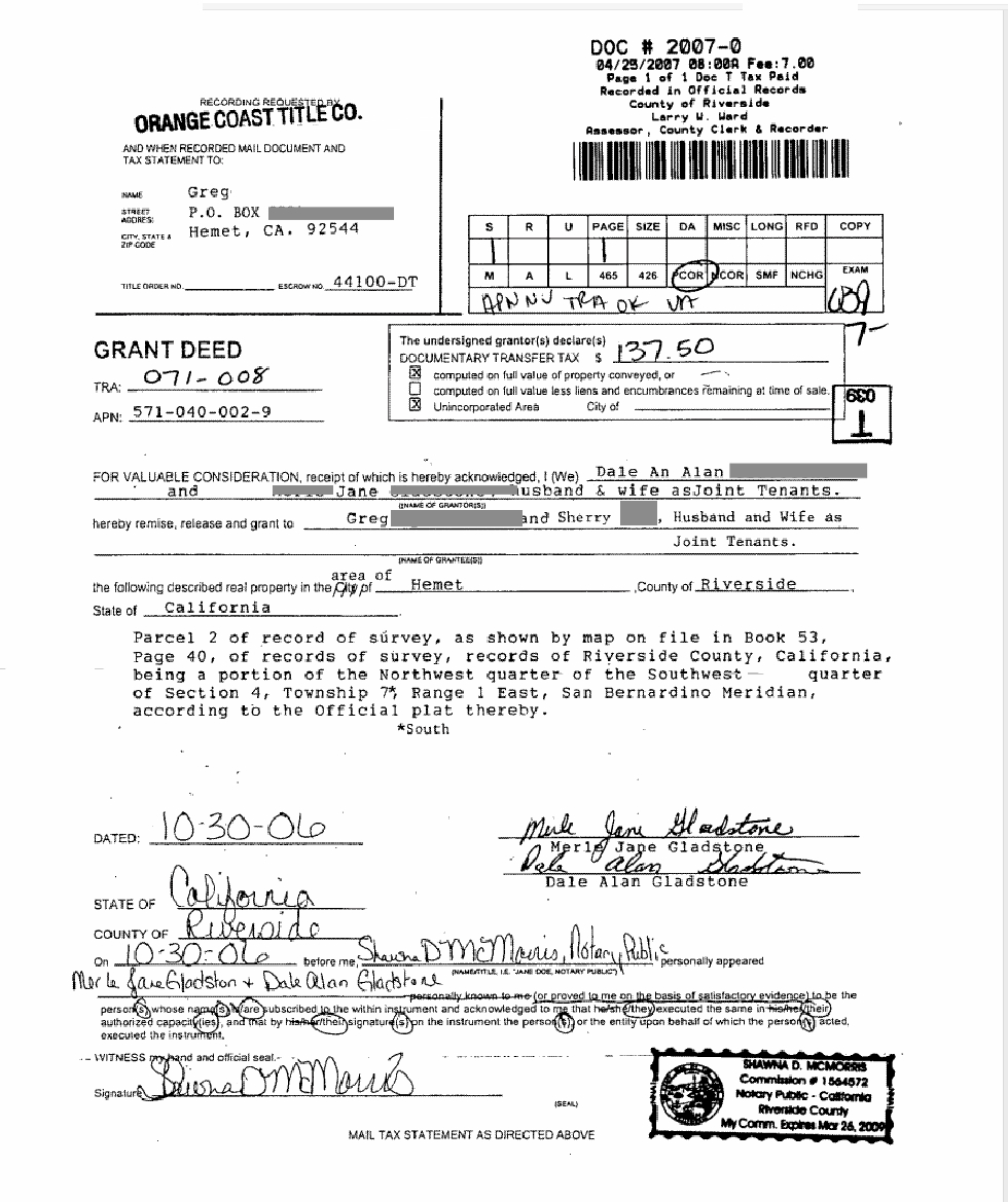 I own Record of Survey 53/40 parcel #2 record #124200 recorded on DEC 20, 1968 APN #571-040-002 common address of 44100 Ginger Circle Hemet CA. This is a copy of my Grant deed. The real property has three separate grants of easement related to the land.