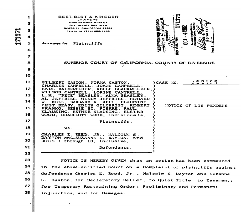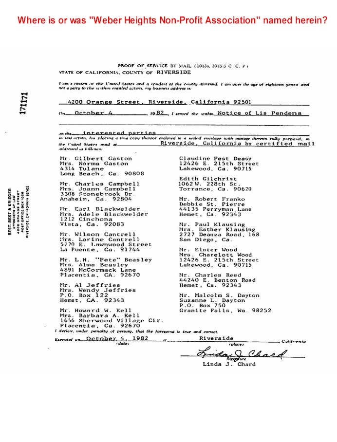 October 4, 1982 Nine years later a notice of lis pendens was filed record # 171171. This is a fact; Weber Height nonprofit Association was not named on Page 1, Page 2 or Page 3. of the action. Look at the named plaintiffs compared to the original 1973 founding directors.