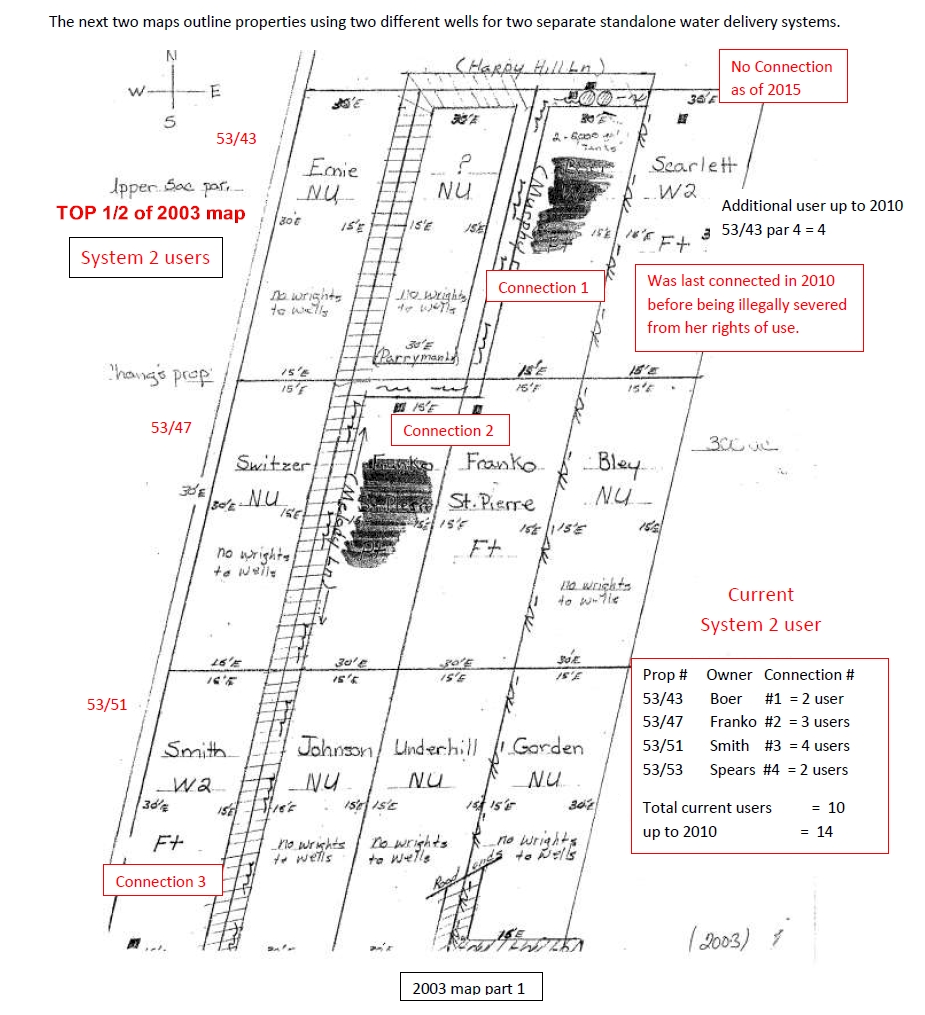 Sometime in 2003 the two following maps on file with DEH provided an accurate number of water supply hook-ups, map 2 and map 1, the maps show that two completely separate systems then existed. Jumping forward in time this document written by Mrs. Deborah St Pierre also claims only three hook-up per the two as noted separate systems that then existed