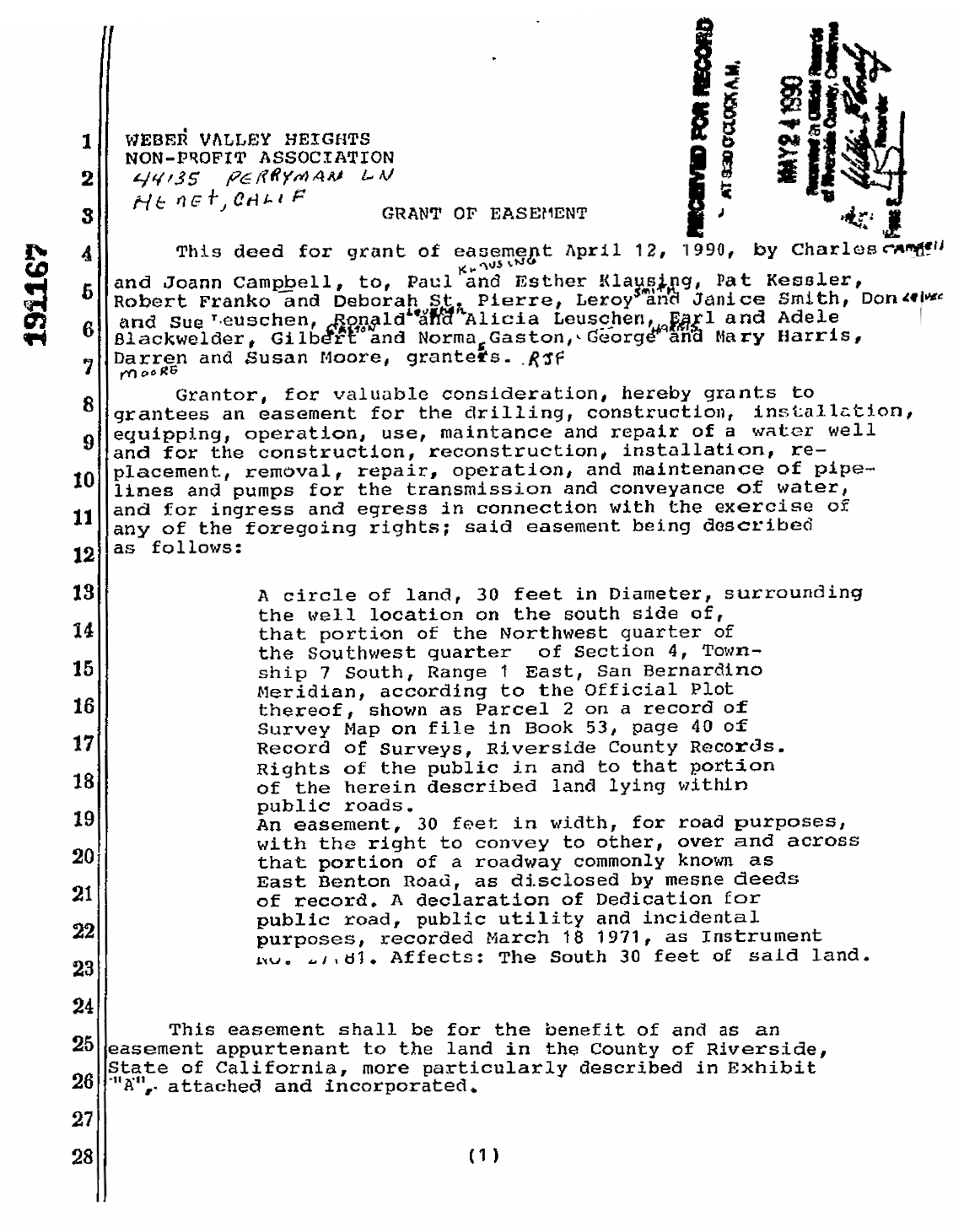 April 13, 1990 Charles Campbell signed a grant of easement for 44100 Ginger Circle and after the words, "This deed for grant of easement April 13, 1990 by Charles and Joann Campbell to", Weber Heights Non-profit was not named anywhere within the granted rights as a benefactor of those real property rights.