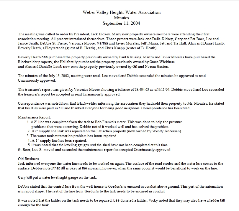 September 11, 2004 as shown Weber Heights Non-profit Association was no longer the name. A newly formed union of Weber Valley Heights Water Association was started. The new Association meeting agenda pg. 1-2 and elections of officers.